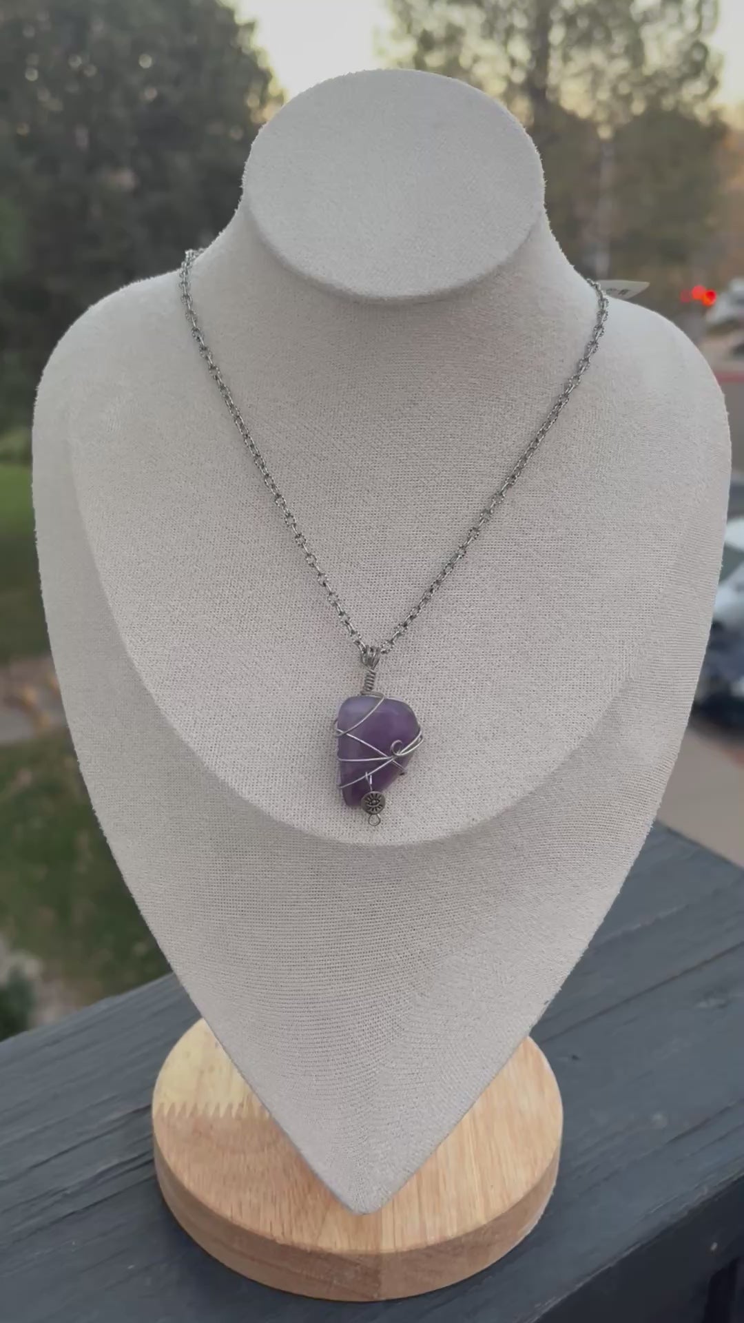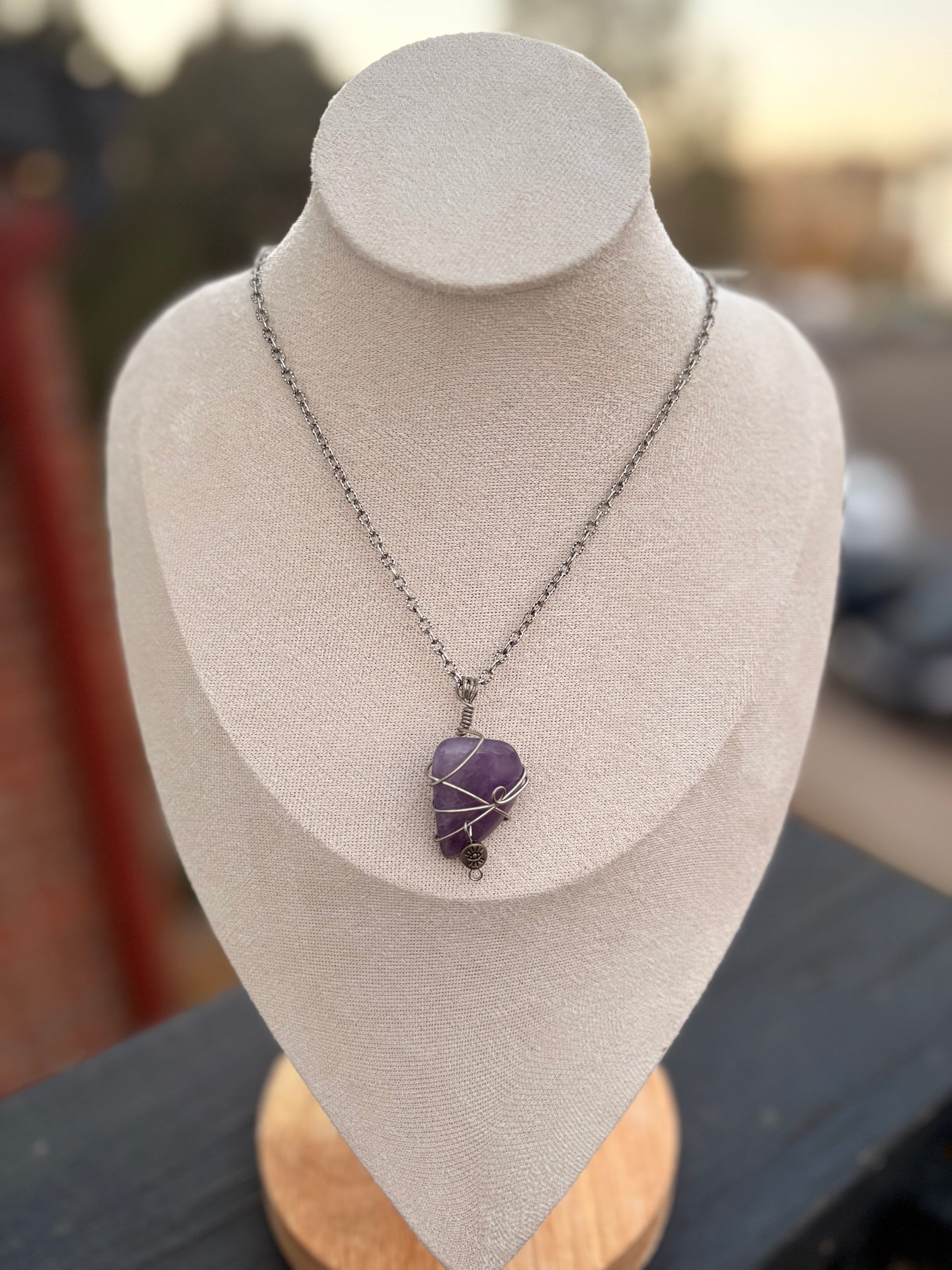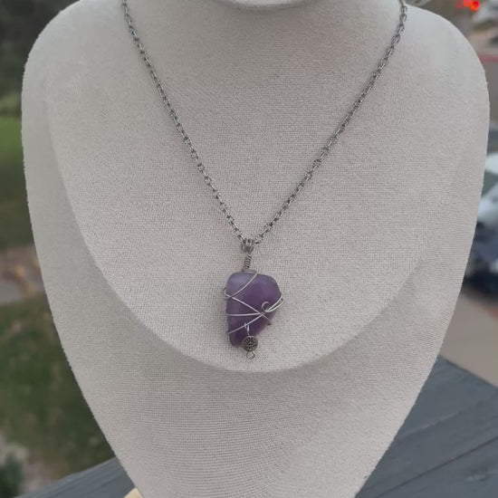 Amethyst Crystal wire wrapped with silver plated wire. Along with a tiny charm to add a little extra :).