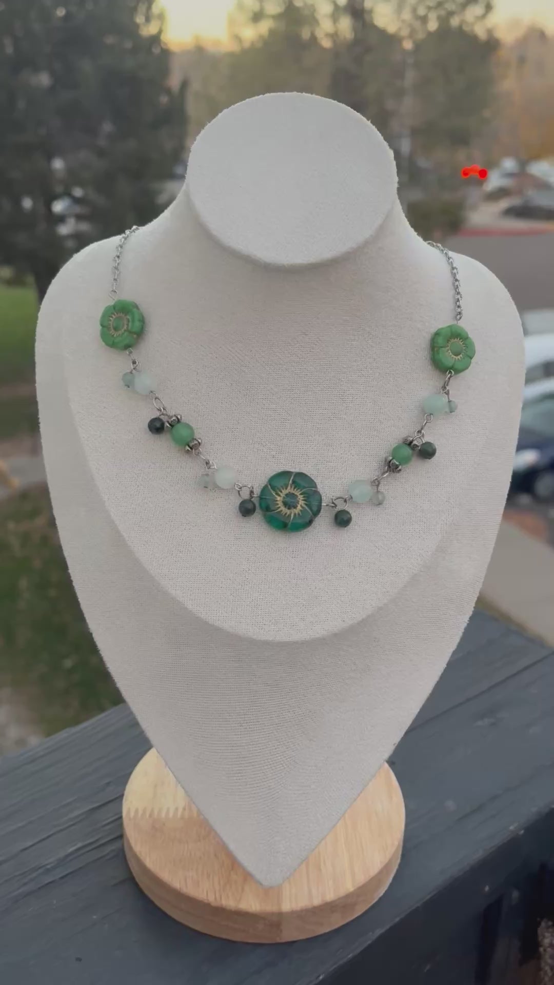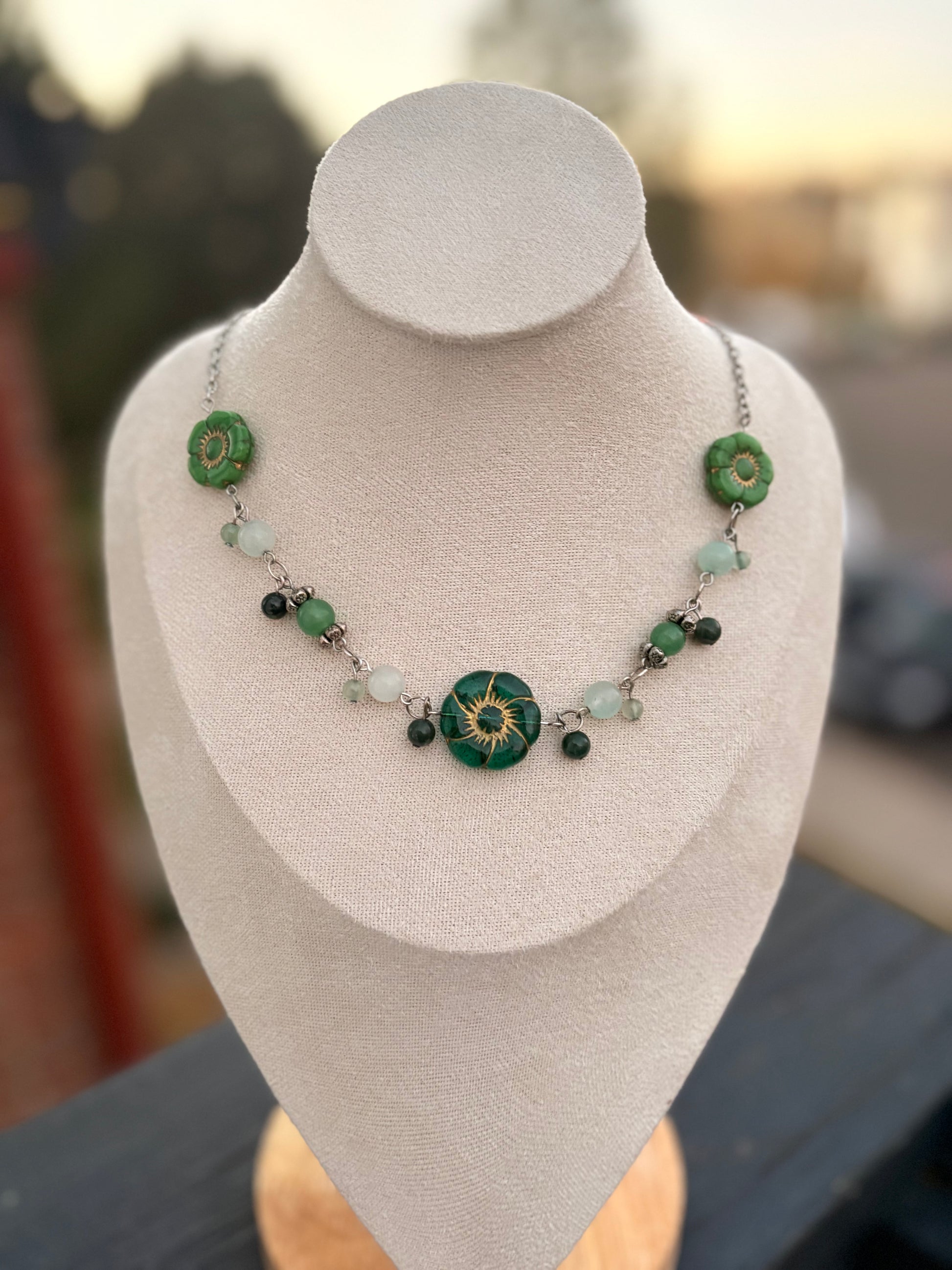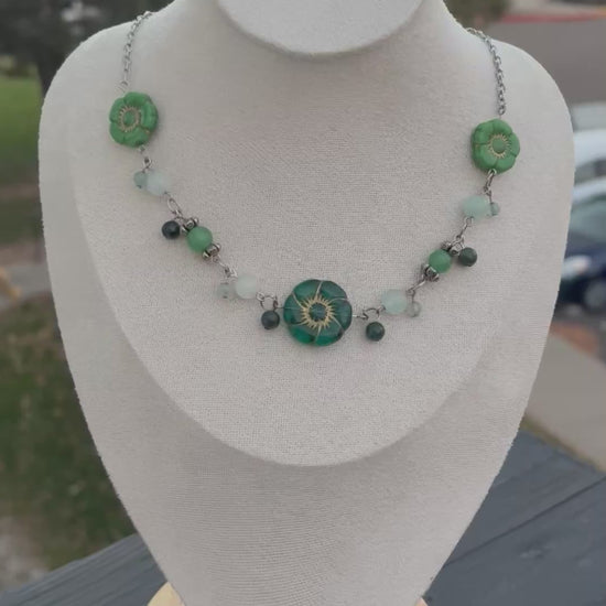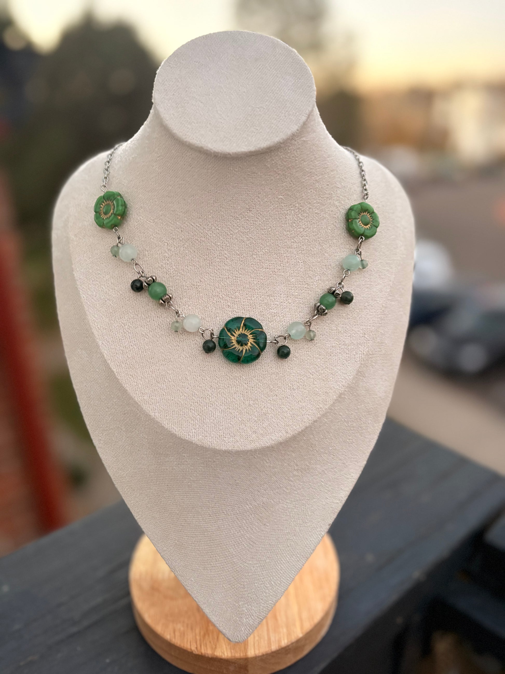 Beaded necklace made with green aventurine, green quartz and other green beads to compliment the rest. A mixture of light and dark green to keep the forest vibe. Make with dyed green agate, green aventurine, jade, and silver plated wire.